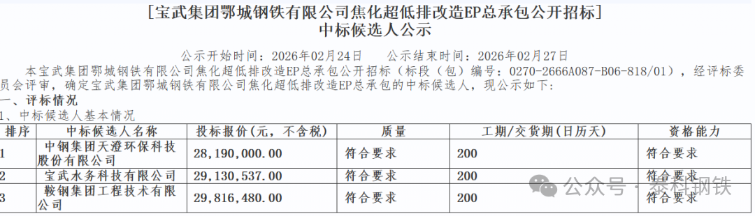 2026年2月24日,寶武集團(tuán)鄂城鋼鐵有限公司焦化超低排改造EP總承包中標(biāo)候選人公示。