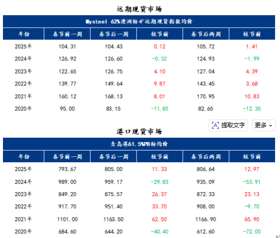 2026年春節(jié)長假期間進(jìn)口鐵礦石遠(yuǎn)期現(xiàn)貨市場(chǎng)的整體活躍度較弱,公開平臺(tái)上沒有任何市場(chǎng)價(jià)格信息出現(xiàn),也未注意到有礦山進(jìn)行單獨(dú)進(jìn)行私下的議標(biāo);二級(jí)市場(chǎng)中主要的市場(chǎng)參與者多數(shù)處于休假的狀態(tài)中,未注意到有詢報(bào)盤及市場(chǎng)成交信息的出現(xiàn)。