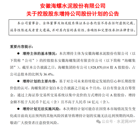 2月25日,海螺水泥發(fā)布公告稱,基于對公司未來持續(xù)穩(wěn)定發(fā)展的信心和長期投資價值的認(rèn)可,公司控股股東海螺集團(tuán)計劃自公告披露之日起6個月內(nèi),以自有資金及自籌資金,通過上海證券交易所交易系統(tǒng)以集中競價的方式增持公司A股股份,增持金額不低于人民幣7億元(含)且不高于人民幣14億元(含)。